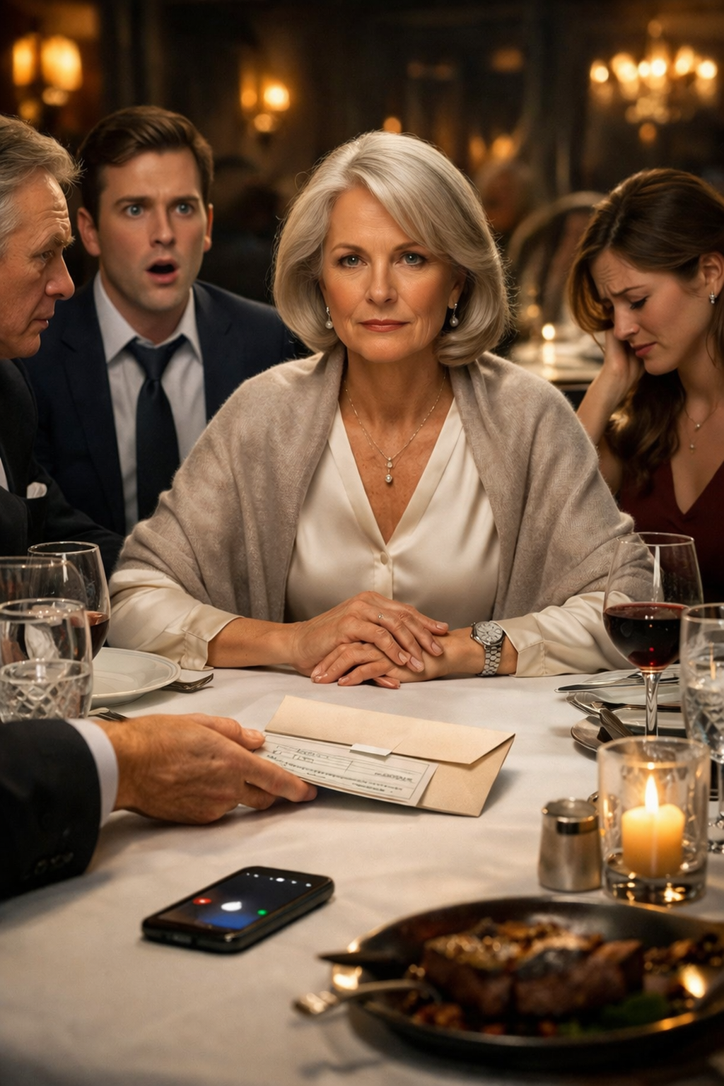 I always let my son-in-law believe I was just a quiet widow living on a tight budget. So when he invited me to dinner with his wealthy parents, I smiled and went. Then his father slid an envelope across the table and said, “It’s time you stopped embarrassing this family.” I opened it, saw the check, and calmly answered my ringing phone: “Yes, put him through. I’ll decide whether Ryan keeps his job on Monday.” They thought they were humiliating me. They had no idea who I really was. People often assume power arrives with noise. In my case, it arrived quietly, then stayed that way because I preferred it. My name is Evelyn Carter, and for the last eleven years, I have owned Carter Logistics Group, a national freight and distribution company headquartered in Chicago. Very few people know that. Even fewer know I still live in the same modest brick ranch house I bought with my late husband before the company ever grew into what it is today. I drive my own car, buy store-brand coffee, and keep my jewelry simple. That image, I’ve learned, makes people comfortable. It also makes them careless.From this story, extract 3 key visual scenes. For each scene, write 1 realistic image prompt in English. Style: realistic photography, high-key lighting, soft even illumination, sharp details, clear facial expression, emotional storytelling, suburban American setting, 50mm lens, shallow depth of field, photorealistic. “Ensure visual consistency: same mother, same child, same house across all scenes.”My daughter, Lily, married a man named Ryan Whitmore two years ago. Ryan was polished, ambitious, and proud of being a rising executive in the logistics industry. He often talked about the CEO of his company with admiration, never realizing he was speaking about the role I actually held behind layers of corporate structure and a professional board that handled public-facing visibility. He worked in one of our regional strategy divisions, far enough from me to never connect the dots. To him, I was just his wife’s quiet mother, a widowed woman who clipped coupons and brought homemade pie to family dinners. At first, I found his assumptions amusing. Then I started noticing the way he spoke around money, status, and “successful families.” He was always respectful to me in a careful, performative sort of way, but there was a condescension underneath it, as though kindness to me was an act of generosity. Lily didn’t seem to notice, or maybe she chose not to. She loved him, and I wanted to believe love would mature him. Then one Sunday afternoon, Ryan called and invited me to dinner with his parents at an expensive steakhouse downtown. He said they wanted to “finally have a proper conversation” with me about the future. His tone was warm, but something about it felt rehearsed. I accepted immediately. If his family wanted to meet the “simple woman” their son had married into, I was curious to see what they thought that meant. That Friday, I wore a plain navy dress, low heels, and the silver watch my husband gave me on our twentieth anniversary. Nothing flashy. Nothing that announced anything. The Whitmores were already seated when I arrived, their table covered in crystal glasses and practiced smiles. Ryan kissed Lily on the cheek, nodded at me, and his mother, Patricia, looked me over in one efficient sweep. The appetizers had barely been cleared when his father straightened his tie, Patricia folded her hands, and Ryan pushed a sealed envelope across the table toward me For a moment, no one spoke. The envelope sat between us like a legal notice or a threat dressed as courtesy. I looked from Ryan to his parents, then picked it up without opening it. Patricia gave me a small smile, the kind women use when they want to appear gracious while delivering something cruel. “We thought it would be easier this way,” she said. “Easier than what?” I asked. Ryan exhaled like a man burdened by difficult responsibility. “Lily and I have been discussing our next steps. A house, children, a stronger social position. There are expectations, Evelyn.” I knew then that Lily had not been included in this dinner’s true purpose. She was sitting stiffly, confused, her fingers tightening around her napkin. His father, Charles, leaned forward. “Our family has spent generations building a reputation. Ryan is moving up quickly. He has leadership potential. But image matters. Connections matter. Stability matters.” I slid one finger beneath the flap of the envelope and pulled out a check. Fifty thousand dollars. Patricia’s voice softened, falsely sympathetic. “This is not meant to offend you. We simply believe it may be best if you step back a little. Fewer family appearances. Fewer casual visits. Less… visibility.” Lily went pale. “What?” Ryan jumped in before I could answer. “Mom, Dad aren’t saying you’re a problem. Just that the worlds are different. We’re starting to meet investors, board members, people with influence. They may not understand—” “They may not understand what?” I asked calmly. He hesitated. “Your lifestyle. Your background.” My background. I almost laughed. Lily turned to him, horrified. “You invited my mother here to pay her off?” “It’s not like that,” Ryan said, though of course it was exactly like that. “It’s practical. We can help her too. This amount could make things easier.” I looked at my daughter first. Her eyes were wet, and I could see the moment her trust in her husband began to crack. Then I looked back at Ryan, really looked at him.