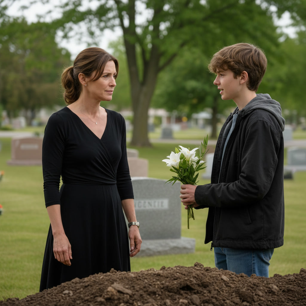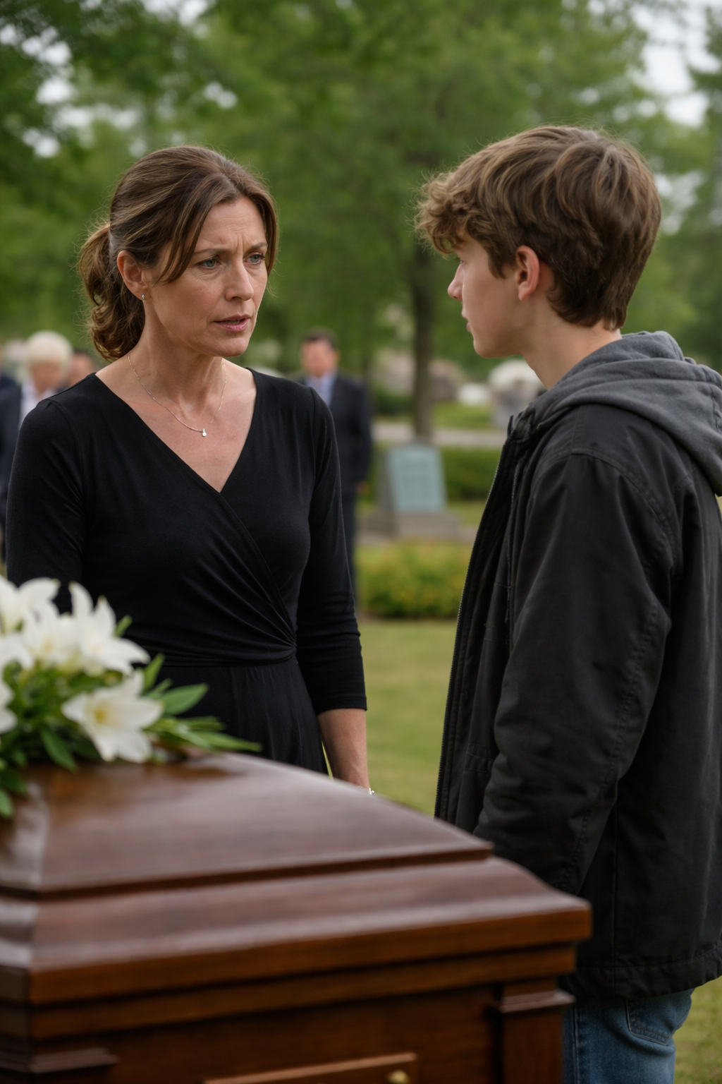 “I think there must be some mistake,” I said quickly, though my stomach twisted. “You shouldn’t be here. This is a private family service.”