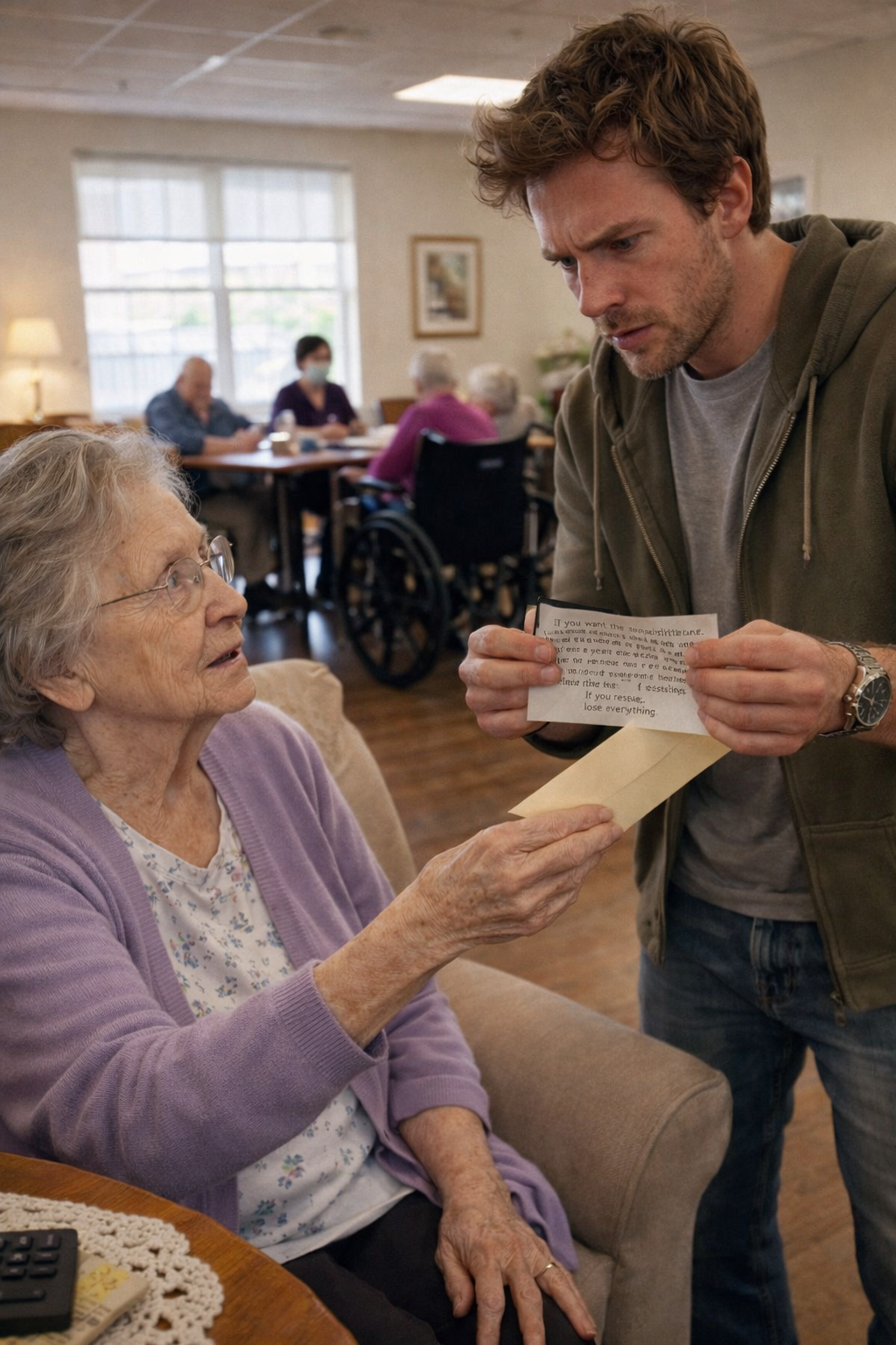 I’m 74, living in a nursing home my own grandson dumped me in after tricking me into selling my house for his “girlfriend’s surgery.” When I suddenly inherited a fortune years later and he came crawling back for “his share,” I handed him $50 and a message written across the bills that forced him to choose: a year working as a low-paid caregiver… or lose every penny forever.