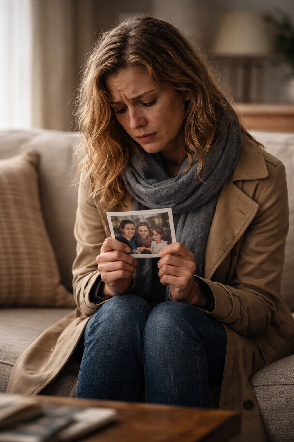 She stood there, staring at an old family photo. The laughter in it seemed to echo in her mind, almost mocking what she had lost.