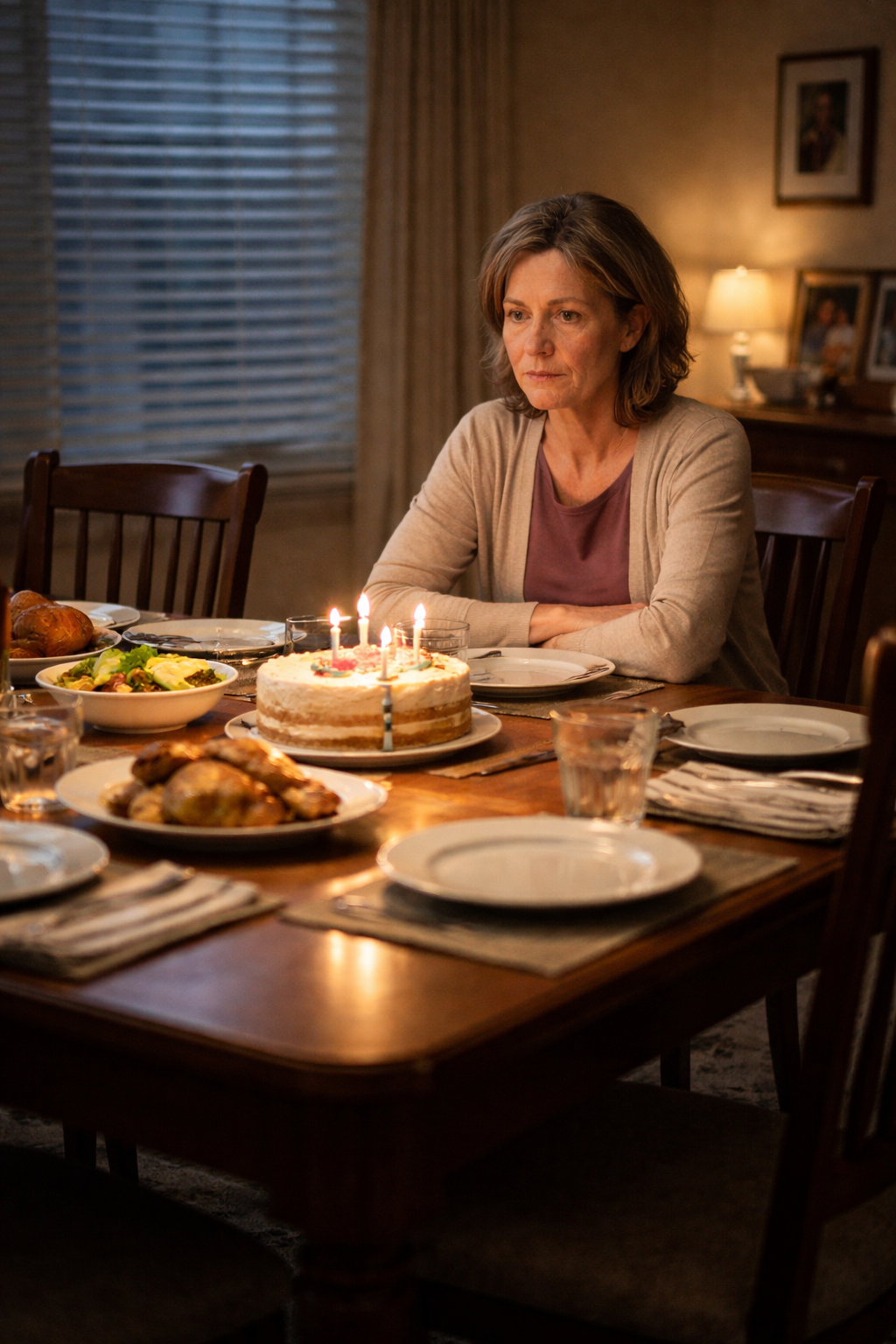 At seven, the food cooled. At eight, the candles burned low. At nine, I sat at the head of the table and stared at six empty chairs.