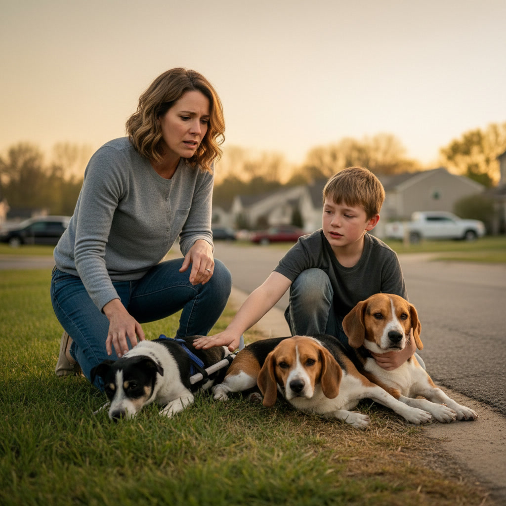 Three dogs lay in the dirt, their bodies trembling, their back legs dragging when they tried to move. It looked like a hit-and-run.