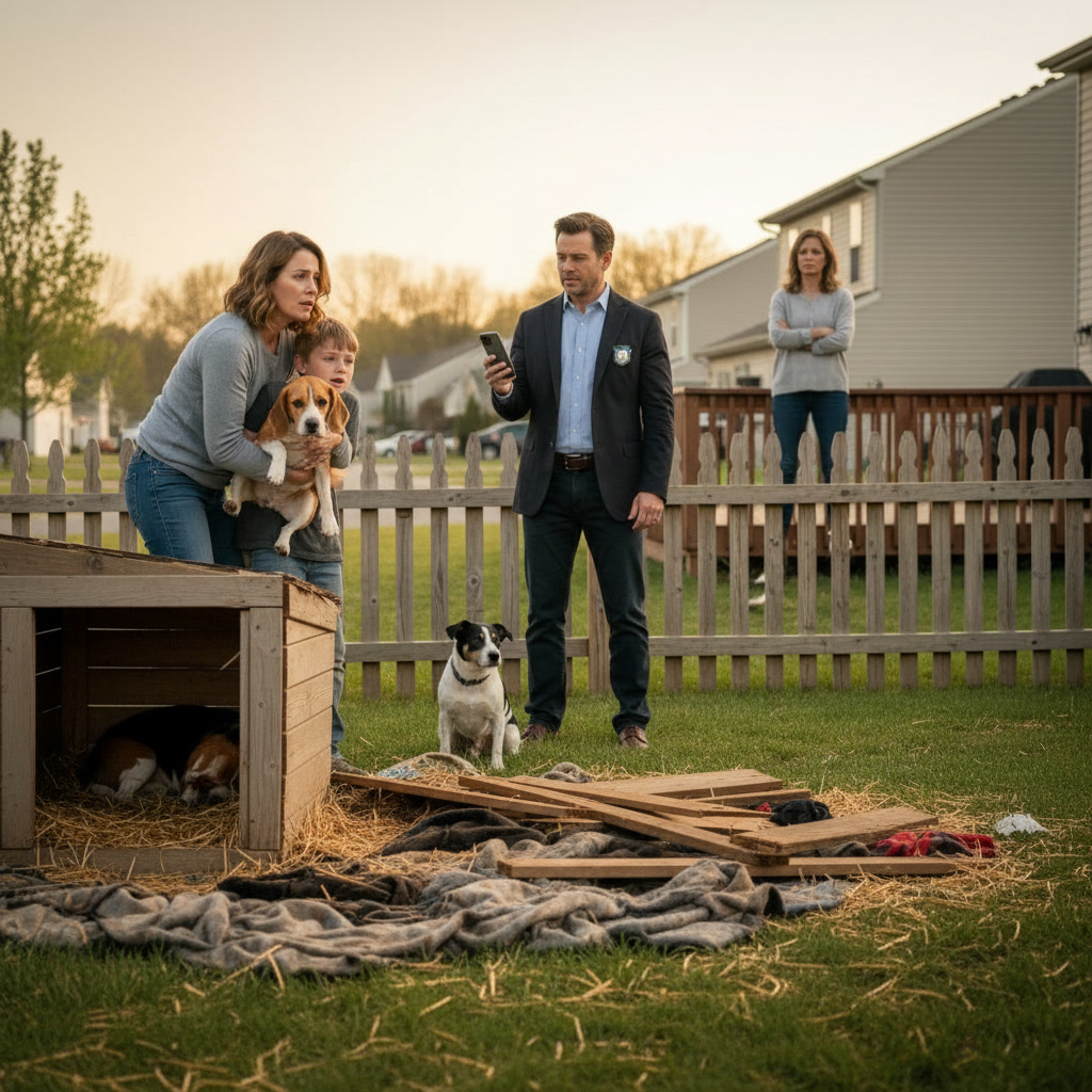 The shelter was destroyed—wood splintered, blankets soaked in dirt, fence torn open.