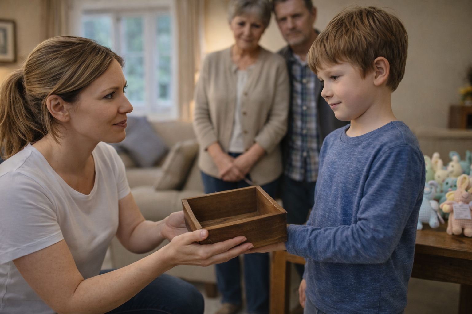 Liam kept them folded in a box in his room. He’d sit with them sometimes. Not playing. Not crying.