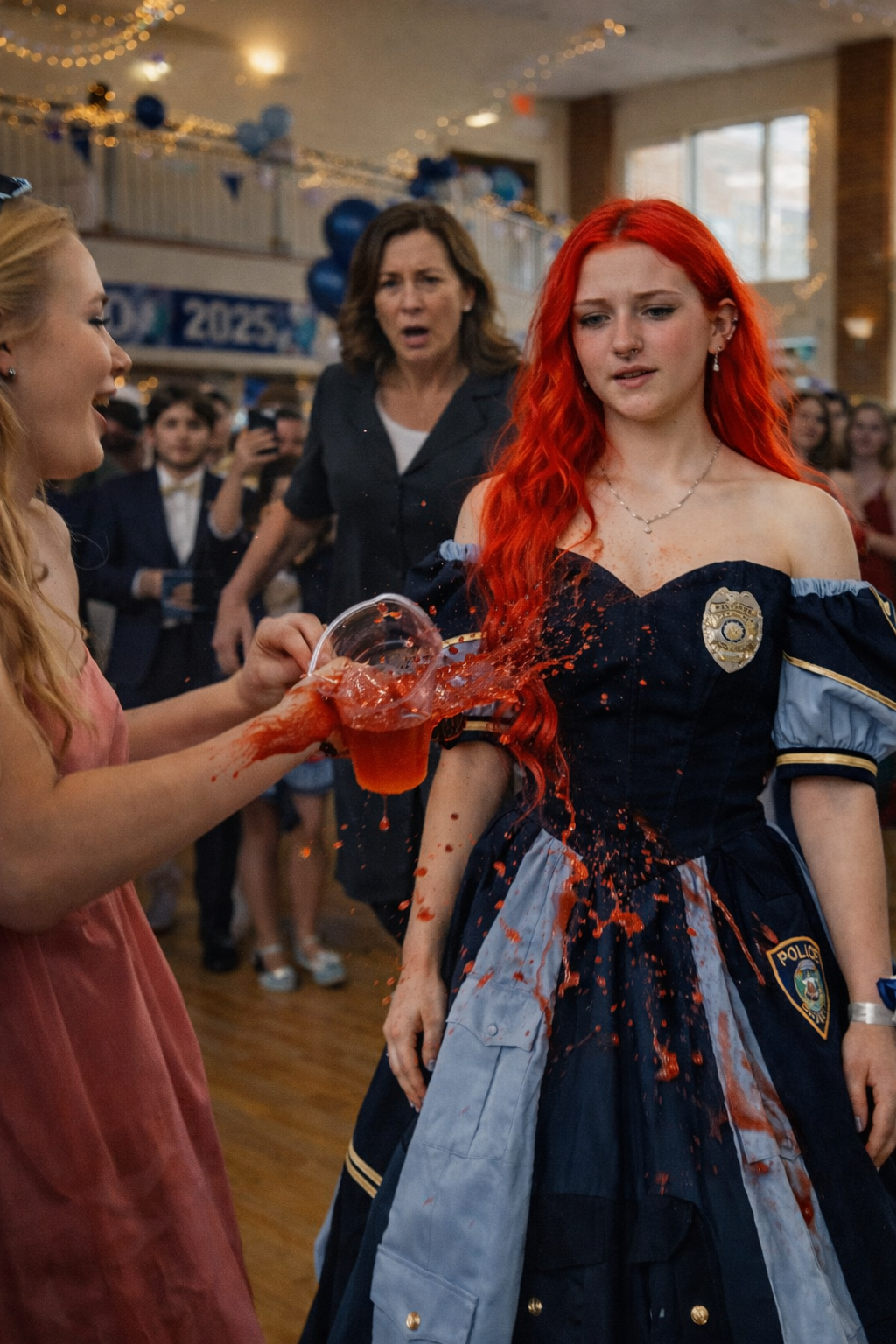 My daughter wore a prom dress she made from her late father’s police uniform. When a girl poured punch all over it, she just stood there, trying to clean his badge. Then the girl’s mother took the mic… and exposed something no one saw coming.