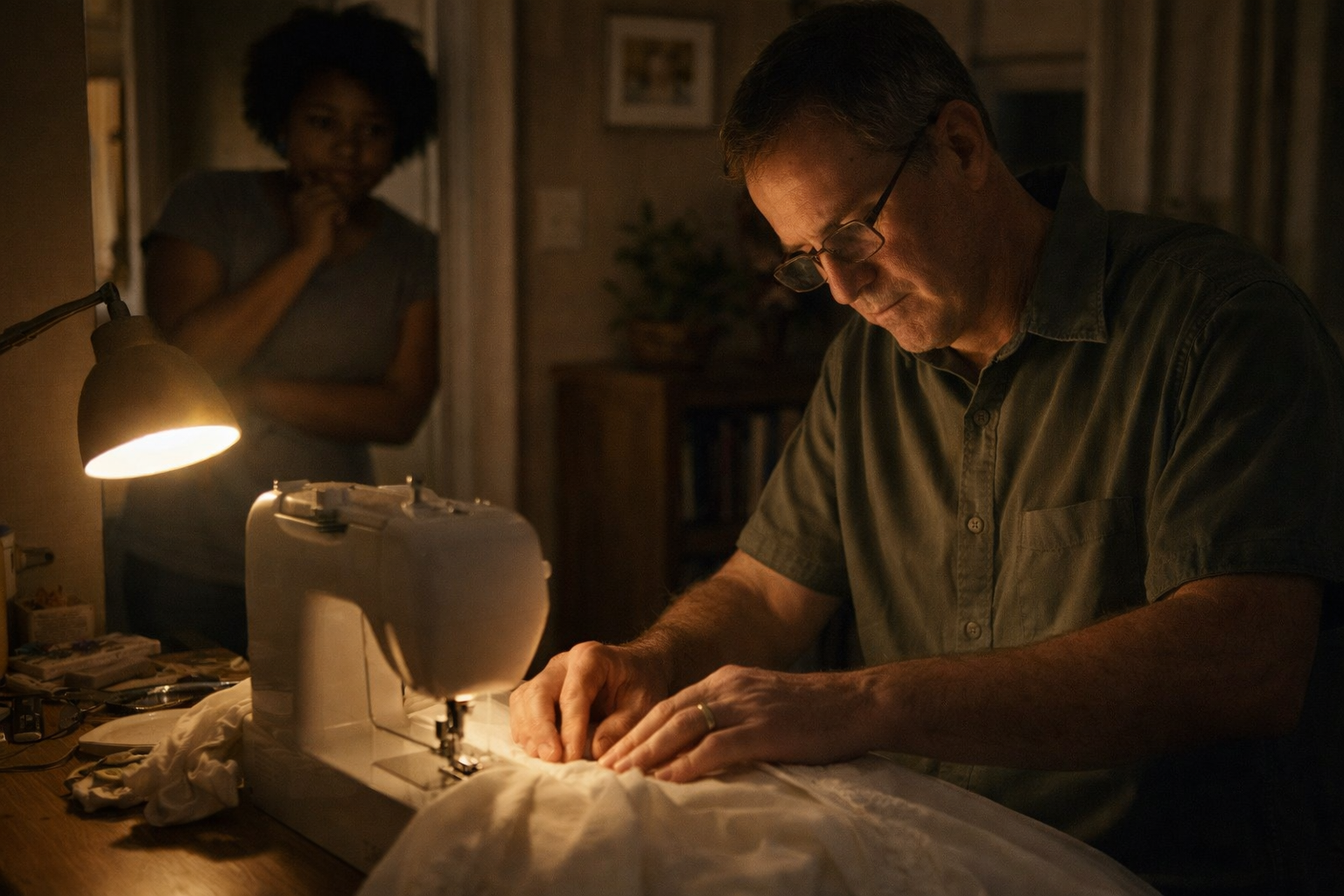 One night, I stepped into the hallway and saw him bent over ivory fabric under the lamp, reading glasses low on his nose, guiding the cloth with careful hands.